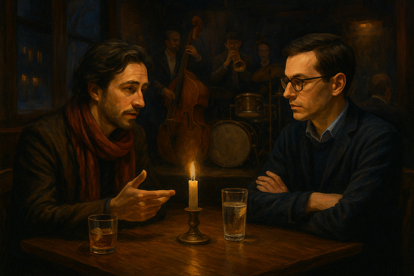 Milo (answering the phone on speaker setting while rummaging in the fridge): Oh god, Adrian, please—can we talk about anything other than philosophy…